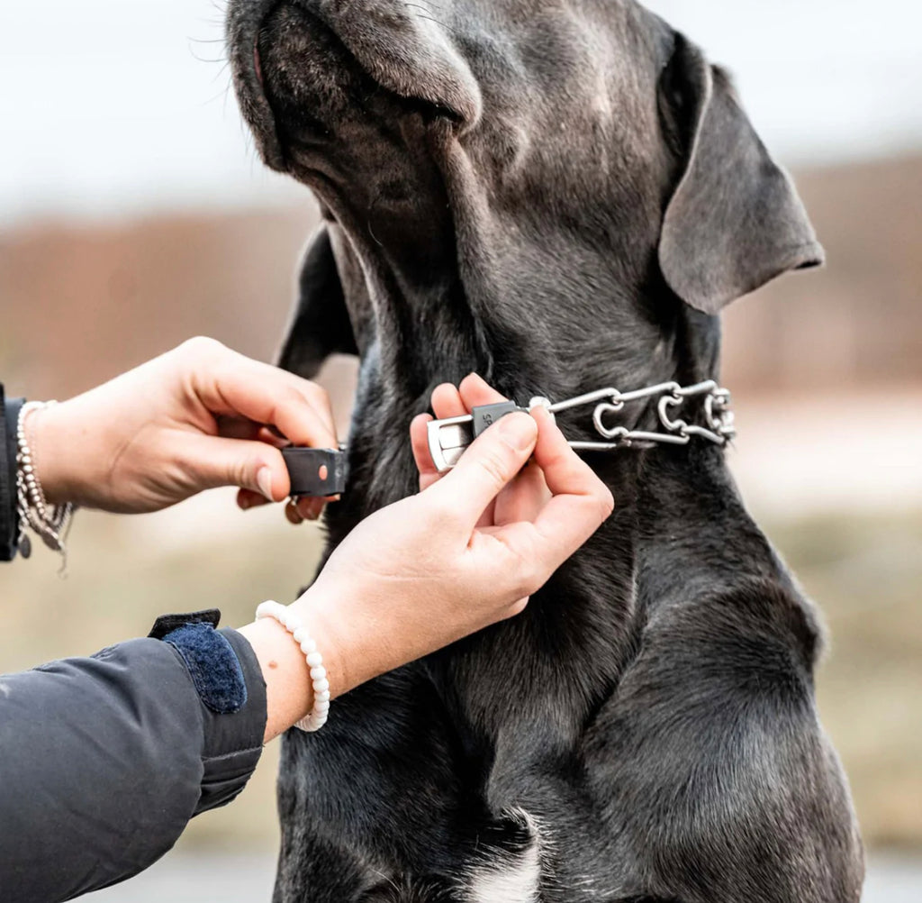 Herm Sprenger is one of the most recognizable and popular names in obedience training tools. A safe and effective alternative to choker collars, it puts even pressure around the neck, about every half inch, pinching the skin in a band. This collar does not apply direct pressure to the trachea, so you can train your dog with little or no tugging, jerking, or pulling. The addition of a center plate connector can be replaced with a Cliclock quick release buckle and still allows the middle link to be configured symmetrically, enabling the prongs to tighten in the same direction. Made of high quality German stainless steel.