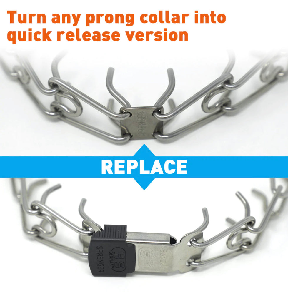 • NO MORE FIGHTING TO GET LINKS OPEN EVERY TIME - Turn your prong collar into quick release version. Simply replace center plate with ClicLock buckle.