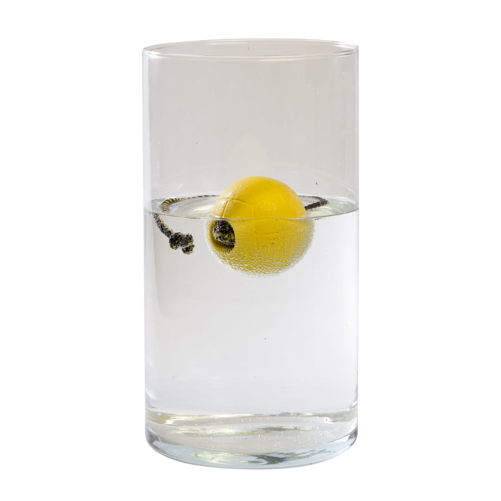 A soft yellow rubber ball with a string handle is designed for fun and learning to retrieve.